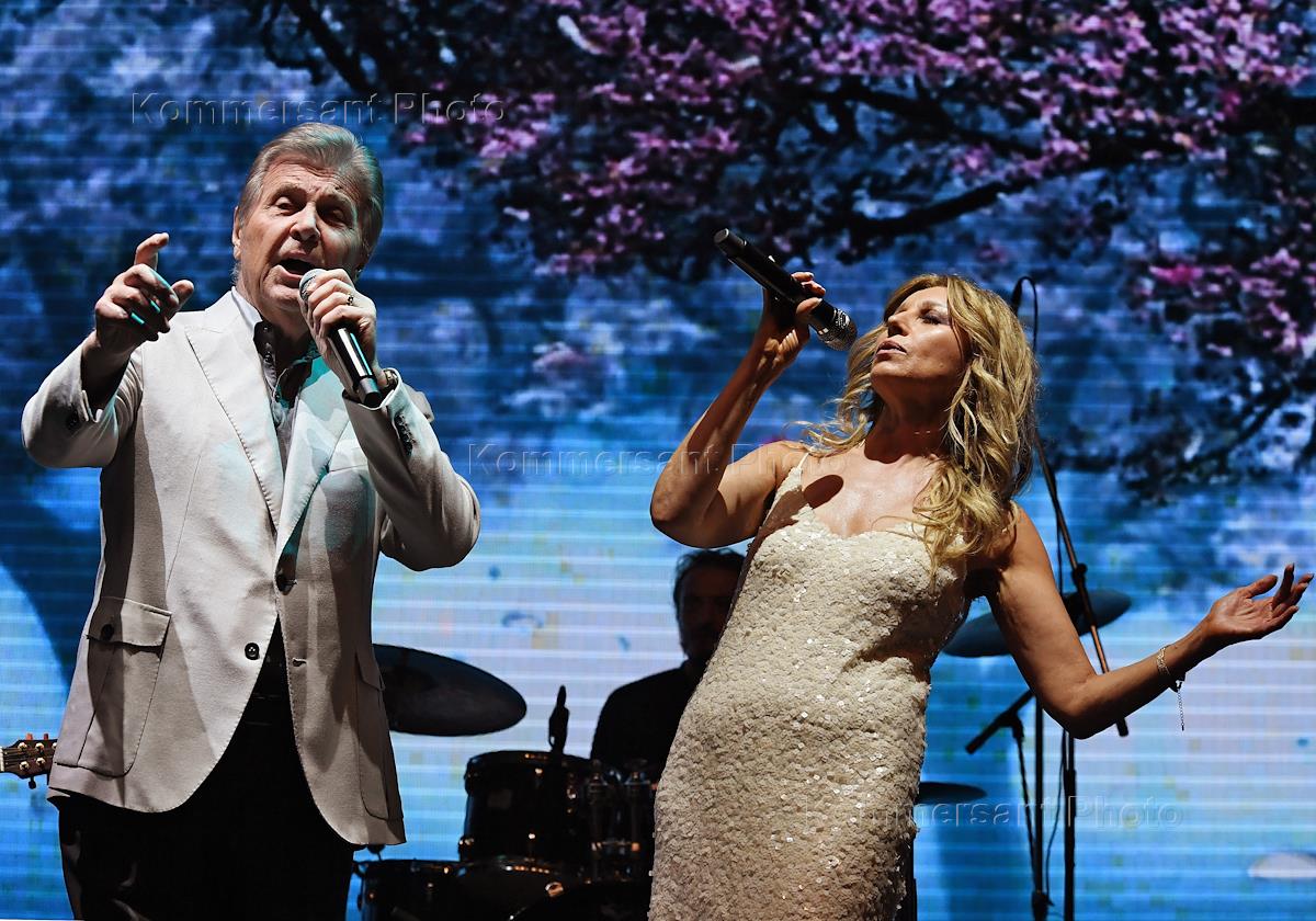Concert of Lev Leshchenko "Give me back my 1977" on the club stage of Glavclub Green Concert. Singer Lev Leshchenko (left) and singer Irina Nelson (right) during a concert.