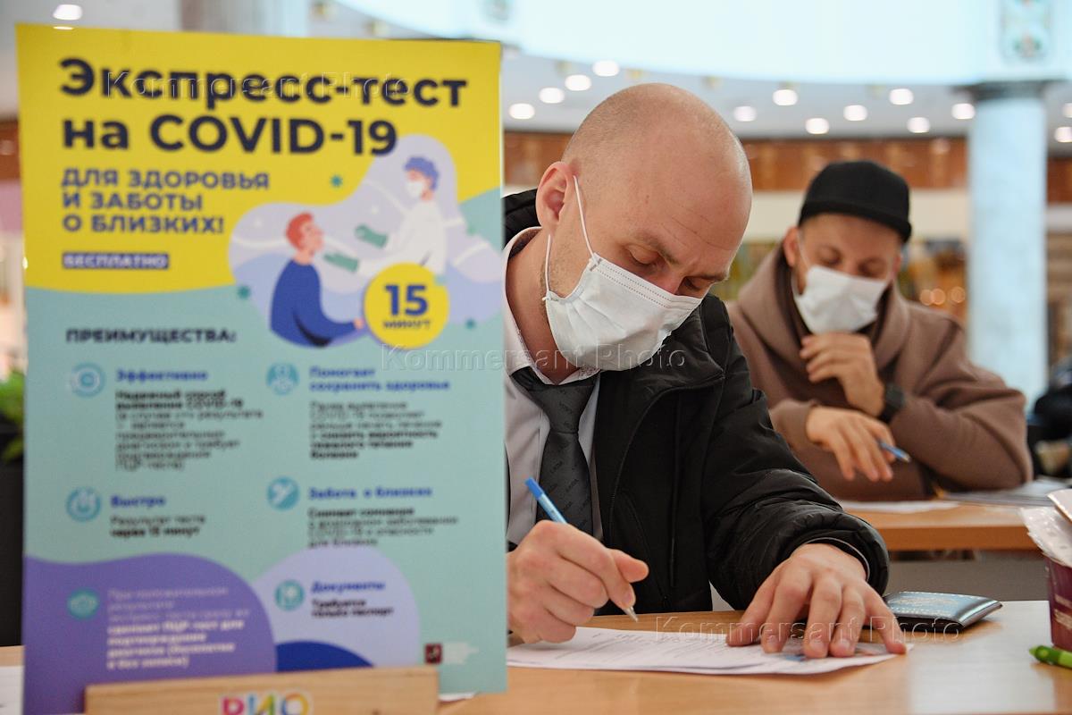 Жанровая фотография. Сдача бесплатных экспресс-тестов на COVID-19 в Торгово-развлекательном центре "РИО" на Дмитровском шоссе. Посетители во время сдачи теста.