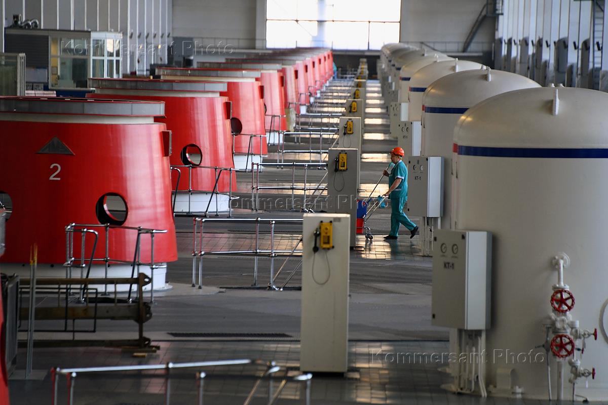 Акционерное общество "РУСАЛ Красноярский алюминиевый завод". Электролизный цех. Рабочие в защитных костюмах во время работы в цехе.