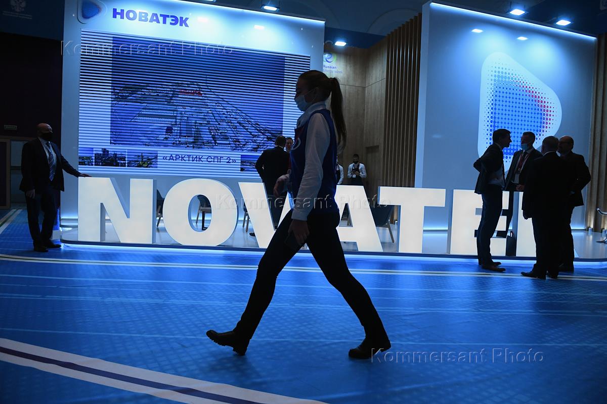 Международный форум "Российская энергетическая неделя (РЭН) 2021" в Центральном выставочном зале "Манеж". День первый. Жанровая фотография. Логотип российской газовой компании "Новатэк".