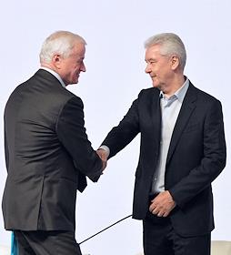 Форум "Российская энергетическая неделя" в Центральном выставочном зале "Манеж". Пленарное заседания "Перезапуская энергетику городов и сообществ: реализация энергоперехода на всех уровнях общества". Председатель правления, генеральный директор ПАО "Т Плюс" Андрей Вагнер (слева) и мэр Москвы Сергей Собянин (справа) перед началом заседания.