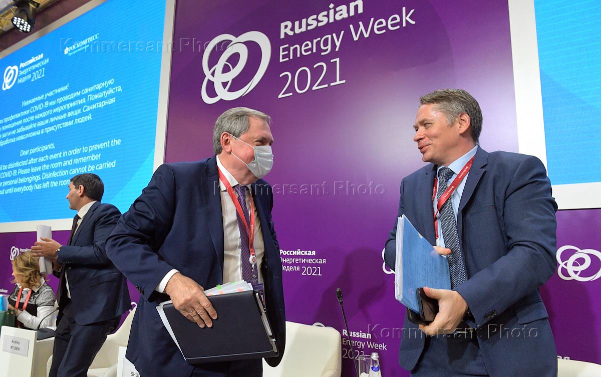 Форум "Российская энергетическая неделя" в Центральном выставочном зале "Манеж". Пленарное заседания "Перспективное развитие электроэнергетики: сохраняя надежность, повышая технологичность". Министр энергетики России Николай Шульгинов (в центре) и председатель правления АО "Системный оператор Единой энергетической системы" Федор Опадчий (справа) после окончания заседания.