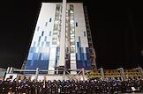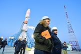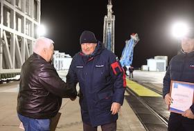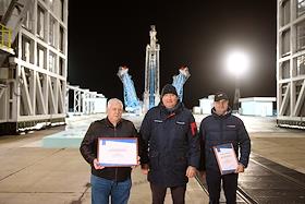 Космодром "Восточный". Церемония запуска ракеты-носителя "Союз-2.1б" с разгонным блоком "Фрегат" и 36 космическими аппаратами OneWeb на борту. Ракета на старте. Сотрудники космодрома на церемонии.