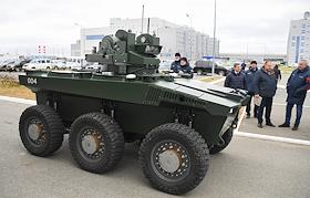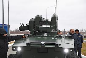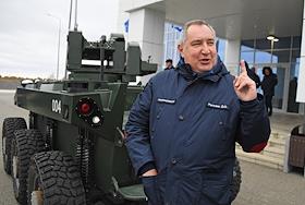 Космодром "Восточный". Церемония запуска ракеты-носителя "Союз-2.1б" с разгонным блоком "Фрегат" и 36 космическими аппаратами OneWeb на борту. Генеральный директор Государственной корпорации по космической деятельности "Роскосмос" Дмитрий Рогозин на презентации робототехнического комплекса "Маркер" в системе охраны космодрома "Восточный".