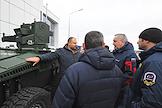 Космодром "Восточный". Церемония запуска ракеты-носителя "Союз-2.1б" с разгонным блоком "Фрегат" и 36 космическими аппаратами OneWeb на борту. Генеральный директор Государственной корпорации по космической деятельности "Роскосмос" Дмитрий Рогозин (в центре) на презентации робототехнического комплекса "Маркер" в системе охраны космодрома "Восточный".