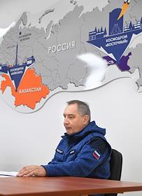 Космодром "Восточный". Церемония запуска ракеты-носителя "Союз-2.1б" с разгонным блоком "Фрегат" и 36 космическими аппаратами OneWeb на борту. Генеральный директор Государственной корпорации по космической деятельности "Роскосмос" Дмитрий Рогозин (справа) во время пресс-конференции перед началом церемонии.