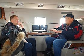 Подготовка к церемонии запуска ракеты-носителя "Союз-2.1б" с разгонным блоком "Фрегат" и 36 космическими аппаратами OneWeb на борту на космодроме "Восточный". Генеральный директор Государственной корпорации по космической деятельности "Роскосмос" Дмитрий Рогозин (слева) и специальный корреспондент ИД "КоммерсантЪ" Андрей Колесников (справа) на борту самолета.