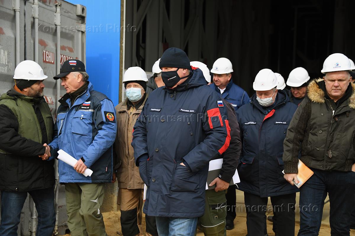 Космодром "Восточный". Генеральный директор Государственной корпорации по космической деятельности "Роскосмос" Дмитрий Рогозин (в центре) и специальный корреспондент ИД "КоммерсантЪ" Андрей Колесников (второй справа) во время осмотра строительства стартового комплекса для космического ракетного комплекса (КРК) "Ангара".