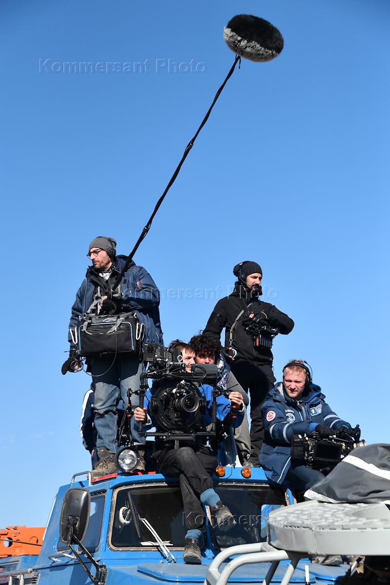 Встреча космонавта Роскосмоса Олега Новицкого и членов съемочной группы фильма "Вызов" актрисы Юлии Пересильд, режиссера Клима Шипенко. Спускаемый аппарат транспортного пилотируемого корабля "Союз МС-18" совершил посадку в степи юго-восточнее города Жезказган. Режиссер Клим Шипенко во время встречи.
