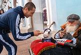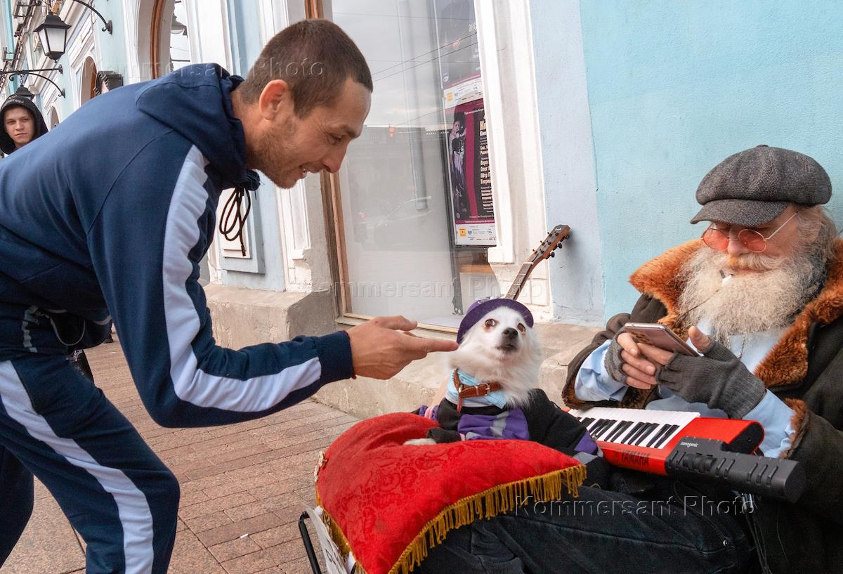 Жанровая фотография. Прохожий на Невском проспекте и пожилой уличный музыкант со своей собакой.