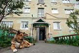 Виды поселка Териберка. Жанровая фотография. Собака возле подъезда жилого дома.