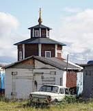 Виды поселка Териберка. Жанровая фотография. Старый автомобиль на фоне часовни.