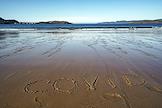 Виды поселка Териберка. Жанровая фотография. Слово "COVID", написанное на песке на берегу Баренцова моря.