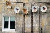 Виды поселка Териберка. Жанровая фотография. Спутниковые антенны "Триколор" на стене жилого дома.