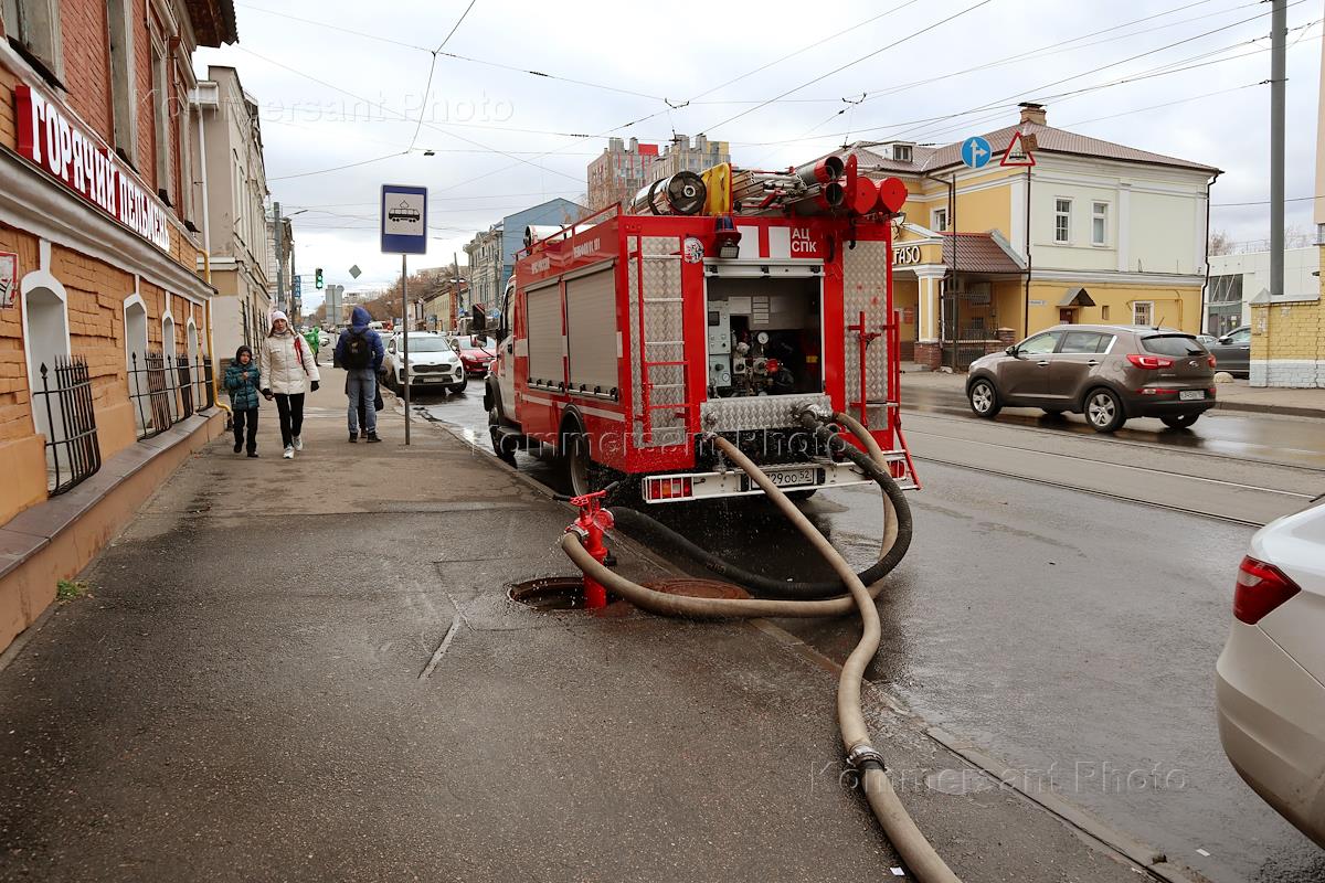 Genre photography. A fire truck of the Russian Emergencies Ministry during the intake of water from a hydrant on Ilyinskaya Street.