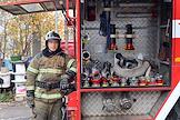 Сотрудник МЧС России стоит у пожарной машины после тушения пожара в доме-коммуне "Дом чекистов" на улице Малой Покровской, 16.