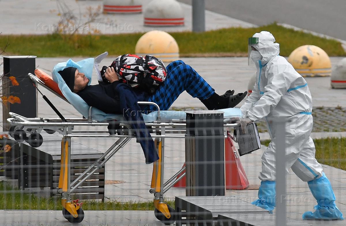 Госпитализация пациентов с коронавирусной инфекцией COVID-19 в Московскую городскую клиническую больницу № 40 "Коммунарка". Мужчина на каталке у приемного отделения больницы.