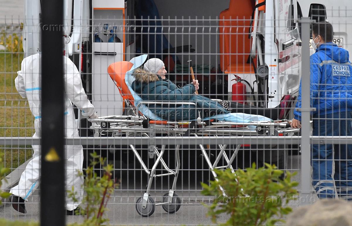 Госпитализация пациентов с коронавирусной инфекцией COVID-19 в Московскую городскую клиническую больницу № 40 "Коммунарка". Женщина на каталке у автомобиля скорой медицинской помощи.