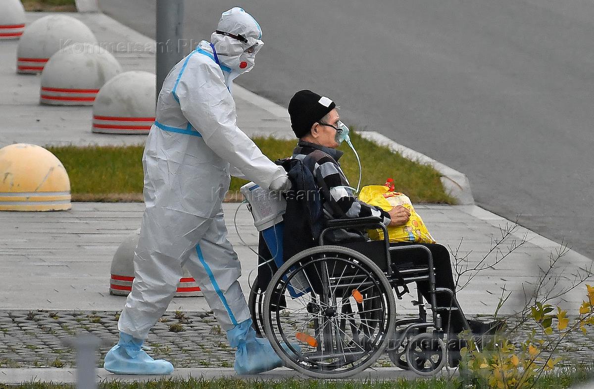 Госпитализация пациентов с коронавирусной инфекцией COVID-19 в Московскую городскую клиническую больницу № 40 "Коммунарка". Пожилая женщина в инвалидном кресле у приемного отделения больницы.
