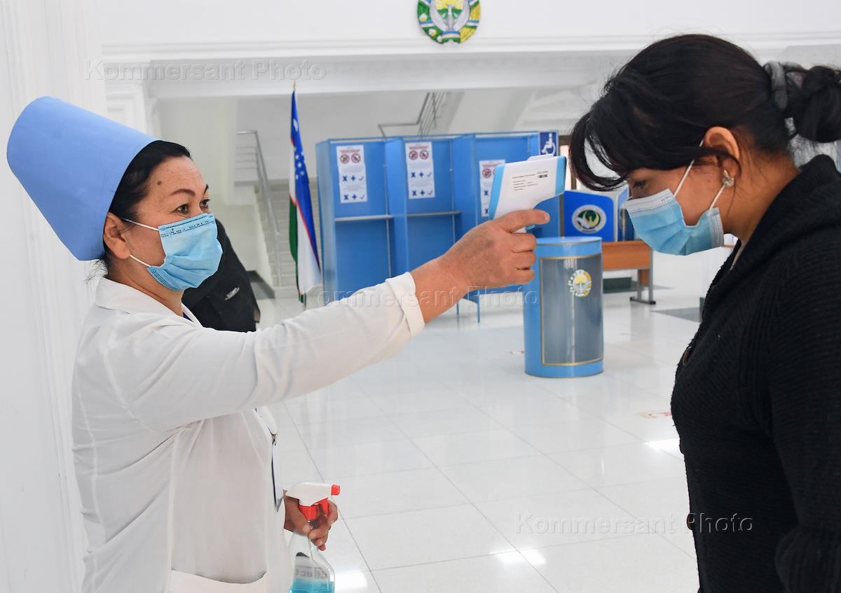 Выборы президента Узбекистана. Жанровая фотография. Подготовка избирательного участка к выборам. Измерение температуры членам избирательной комиссии.