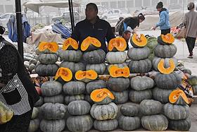 Виды города Термеза. Жанровая фотография. Торговля арбузами и дынями на рынке. Агитационный предвыборный плакат кандидата на должность президента Узбекистана Максуды Варисовой на улице города.