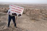 Виды Узбекистана. Граница с Афганистаном в районе города Термез. Жанровая фотография. Мужчина устанавливает табличку с запретом фото- и видеосъемки "Стоп-граница".