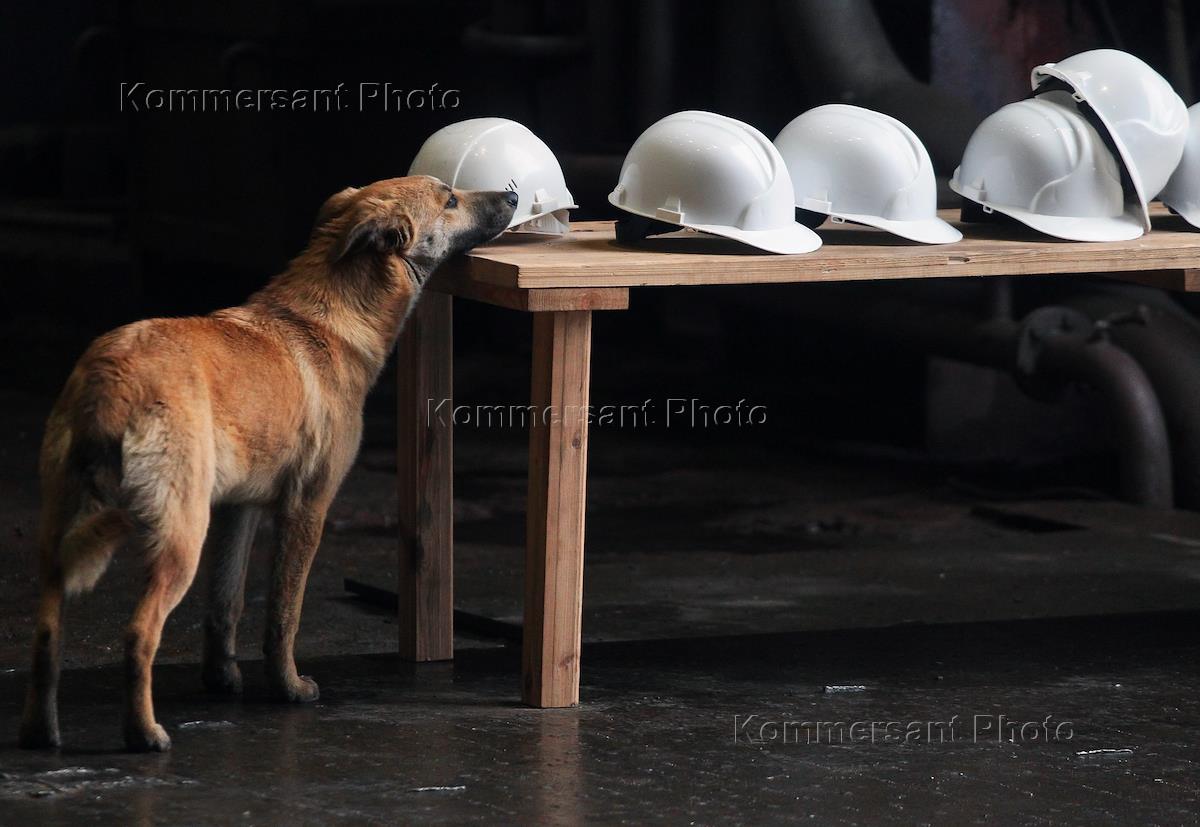 Церемония закладки киля головного сухогруза нового проекта RSD71 "Конструктор Егоров" прошла на АО "Окская судоверфь". Жанровая фотография. Собака возле лавки с защитными касками.