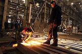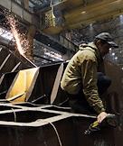 Церемония закладки киля головного сухогруза нового проекта RSD71 "Конструктор Егоров" прошла на АО "Окская судоверфь". Жанровая фотография. Рабочий в сборочном цехе.