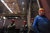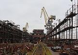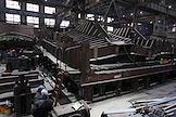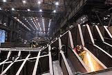 Церемония закладки киля головного сухогруза нового проекта RSD71 "Конструктор Егоров" прошла на АО "Окская судоверфь". Жанровая фотография. Рабочие в сборочном цехе.