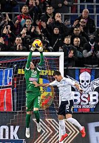 Чемпионат России по футболу. Премьер лига. 12-й тур. Матч между командами ЦСКА (Москва) и "Крылья советов" (Самара) на стадионе "ВЭБ Арена". Вратарь команды ЦСКА Игорь Акинфеев (слева) и игрок команды "Крылья Советов" Гленн Бийль (справа) во время матча.