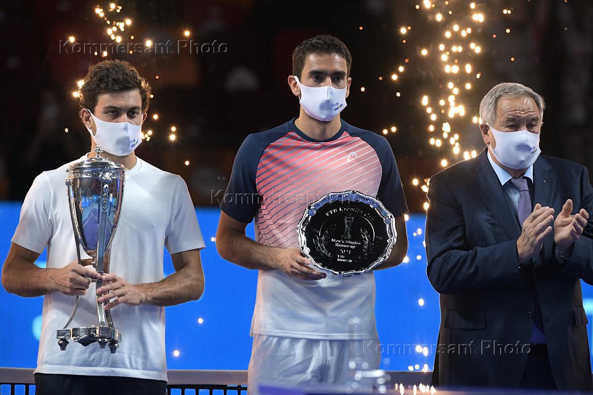 XXXI VTB Kremlin Cup International Tennis Tournament at the Irina Viner-Usmanova Gymnastics Palace. From left to right: Russian tennis player Aslan Karatsev, Croatian tennis player Marin Cilic and President of the Russian Tennis Federation Shamil Tarpishchev during the awards ceremony.
