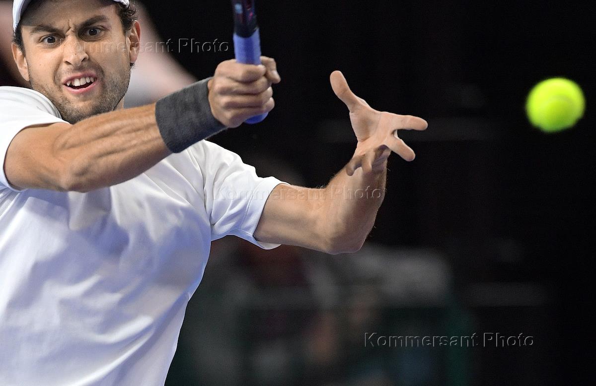 XXXI VTB Kremlin Cup International Tennis Tournament at the Irina Viner-Usmanova Gymnastics Palace. Croatian tennis player Marin Cilic during the final match with Russian tennis player Aslan Karatsev.