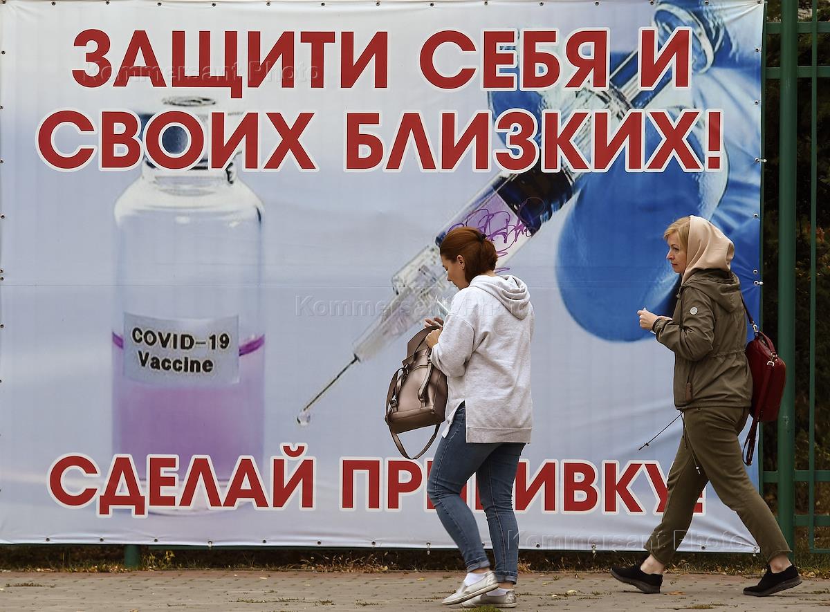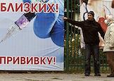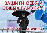Виды Судака. Жанровая фотография. Ситуации с COVID-19 в Крыму. Мужчина под зонтом на фоне плаката социальной рекламы "Защити своих близких! Сделай прививку!".