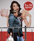 Виды Судака. Жанровая фотография. Ситуации с COVID-19 в Крыму. Женщины с продуктовыми пакетами на фоне рекламного плаката денежного займа.