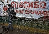 Виды Судака. Жанровая фотография. Ситуации с COVID-19 в Крыму. Плакат-растяжка "Спасибо нашим врачам" сквозь капли дождя на окне.