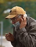 Виды Судака. Жанровая фотография. Ситуации с COVID-19 в Крыму. Пожилой мужчина в медицинской маске разговаривает по мобильному телефону.