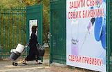 Виды Судака. Жанровая фотография. Ситуации с COVID-19 в Крыму. Плакат социальной рекламы "Защити своих близких! Сделай прививку!" на воротах.