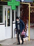 Виды Судака. Жанровая фотография. Ситуации с COVID-19 в Крыму. Мужчина в медицинской защитной маске с палкой-тростью идет возле аптеки.