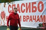 Виды Судака. Жанровая фотография. Ситуации с COVID-19 в Крыму. Мужчина в медицинской защитной маске на фоне плаката-растяжки "Спасибо нашим врачам".