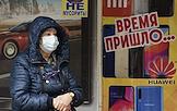 Виды Судака. Жанровая фотография. Ситуации с COVID-19 в Крыму. Женщина в медицинской защитной маске у витрины с надписью "время пришло".