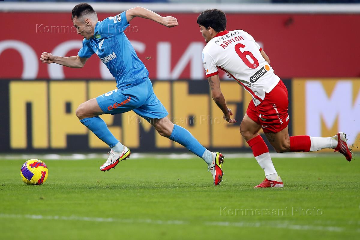 Russian Premier League (RPL). Tinkoff - Russian Football Championship 2021/2022. 12th round. A match between the teams Zenit (St. Petersburg) - Spartak (Moscow) at the Gazprom Arena stadium. Zenit player Andrei Mostovoy (right) and Spartak player Ayrton (center) during a match.