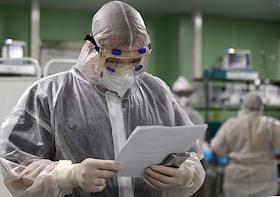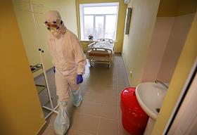 Государственное бюджетное учреждение здравоохранения "Городская клиническая больница №1 имени С.З.Фишера". Медицинский работник в "красной зоне", где проходит лечение больных с коронавирусной инфекцией COVID-19.