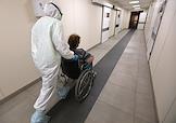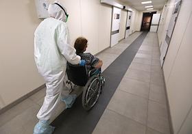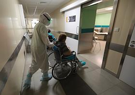 Государственное бюджетное учреждение здравоохранения "Городская клиническая больница №1 имени С.З.Фишера". Медицинский работник и пациент в коридоре "красной зоны", где проходит лечение больных с коронавирусной инфекцией COVID-19.