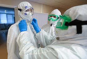 Государственное бюджетное учреждение здравоохранения "Городская клиническая больница №1 имени С.З.Фишера". Медицинские работники во время одевания защитных костюмов у входа в "красную зону", где проходит лечение больных с коронавирусной инфекцией COVID-19.