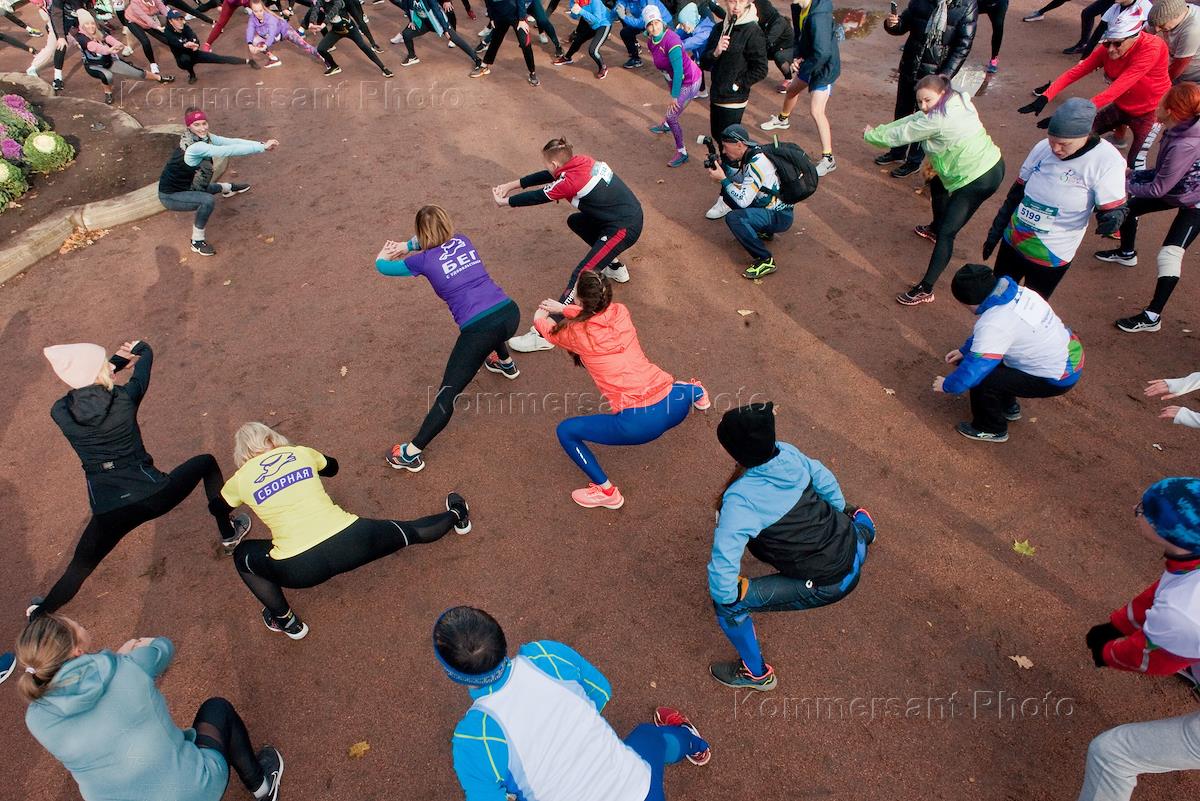 94-й традиционный легкоатлетический пробег Пушкин – Санкт-Петербург, посвященный памяти заслуженного работника культуры, корреспондента газеты "Вечерний Петербург" Валентина Семенова. Участники перед началом пробега.