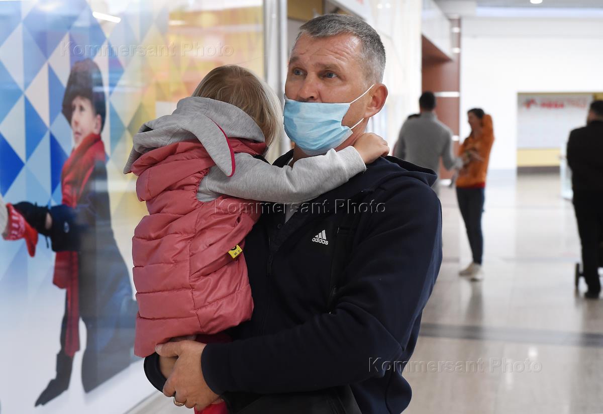 Меры против распространения коронавирусной инфекции COVID-19. Жанровая фотография. Мужчина в медицинской маске с ребенком на руках в торговом центре.