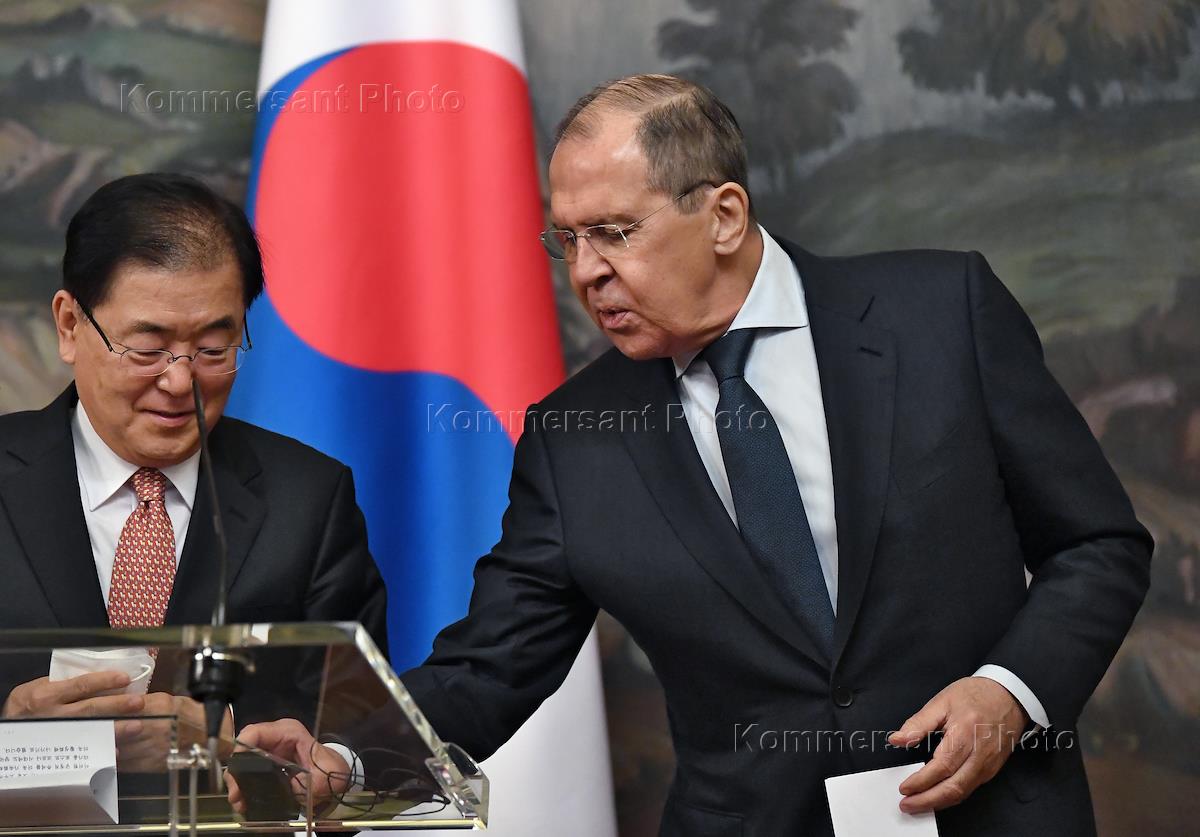 Переговоры министра иностранных дел России Сергея Лаврова с министром иностранных дел Республики Корея Чон Ый Ёном в Доме приемов МИД России. Министр иностранных дел России Сергей Лавров (справа) и министр иностранных дел Южной Кореи Чон Ый Ен (слева) перед началом пресс-конференции по итогам переговоров.