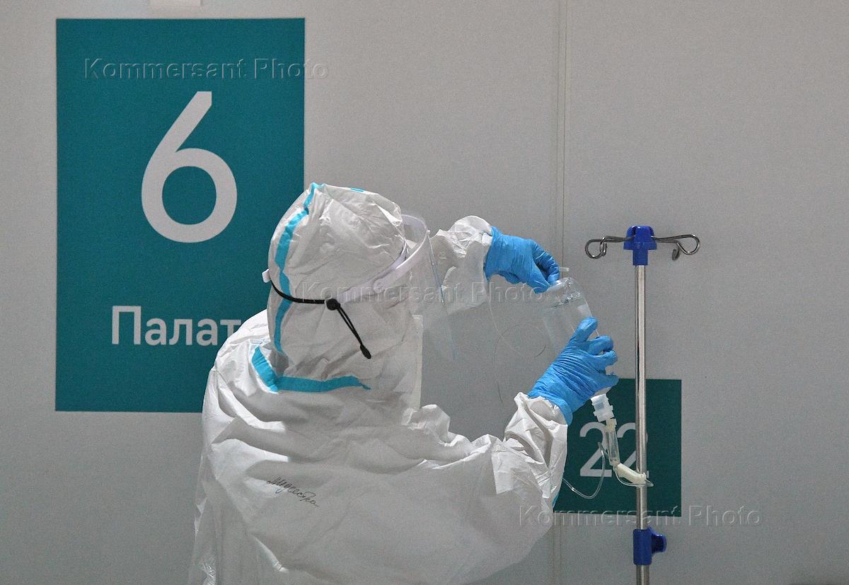 Резервный госпиталь в ледовом дворце "Крылатское" Государственного бюджетного учреждения здравоохранения "Городская клиническая больница №67 имени Л.А. Ворохобова ДЗМ". "Красная зона" для лечения больных с коронавирусной инфекцией COVID-19. Жанровая фотография. Медицинский работника в защитном костюме в палате у больного.