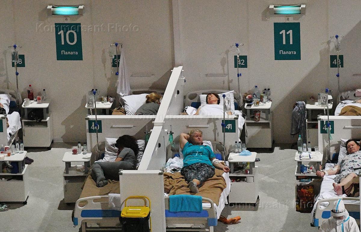 Резервный госпиталь в ледовом дворце "Крылатское" Государственного бюджетного учреждения здравоохранения "Городская клиническая больница №67 имени Л.А. Ворохобова ДЗМ". "Красная зона" для лечения больных с коронавирусной инфекцией COVID-19. Больные в палате.