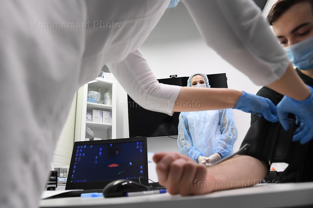 Меры предосторожности и профилактики против коронавирусной инфекции COVID-19. Жанровая фотография. Вакцинация водителей и курьеров, сотрудничающих с компанией Яндекс Go. Медицинский работник измеряет давление мужчине перед началом вакцинации.